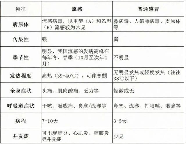 流感与感冒的区别。图片来自中国疾病预防控制中心。